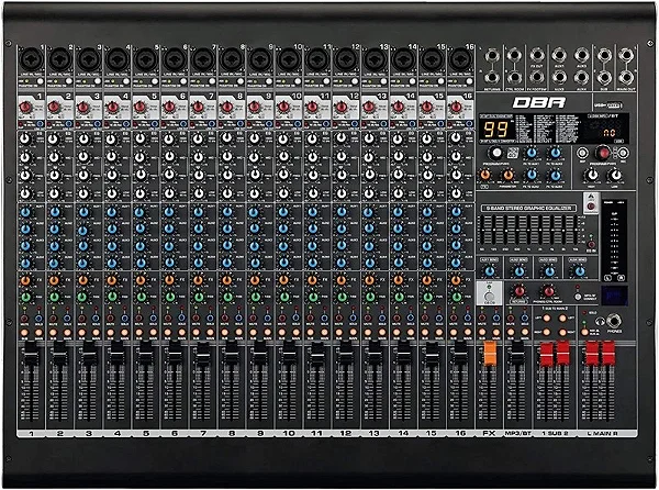 Canais: 16 entradas (12 mono + 2 estéreo)